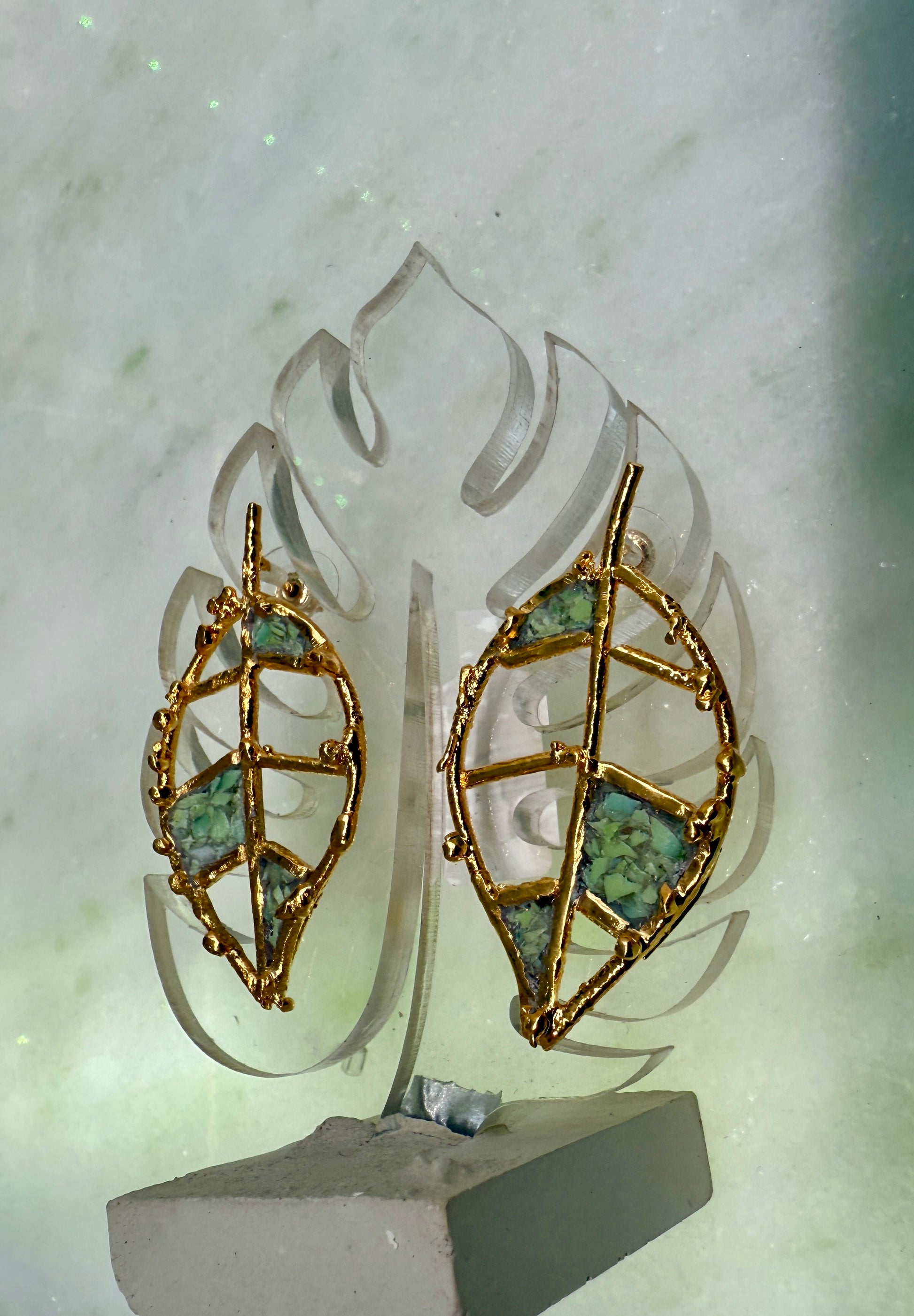 Inspired by nature, handcrafted with soul. These delicate leaf-shaped earrings are made with finely crushed natural stones, set within a hand-formed golden frame. Each pair is a tribute to organic beauty — light, airy, and artistically irregular — making every piece truly one of a kind.