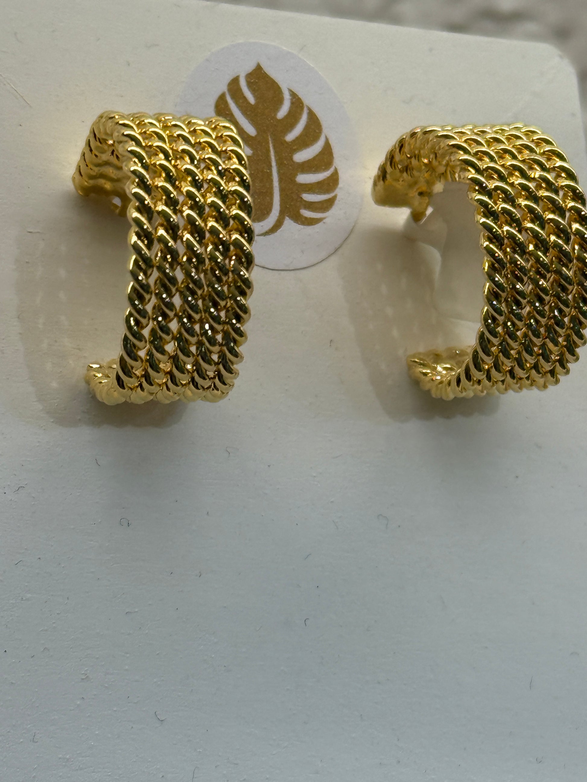 These distinctive earrings feature a multi-strand twisted rope design that gives them depth, shine, and structure—all in a compact hoop silhouette. Handcrafted in Colombia from high-quality stainless steel with a rich gold-tone finish, each piece is a true celebration of craftsmanship and style. Bold yet lightweight, these hoops are a unique statement piece for those who appreciate fine detail and timeless texture.